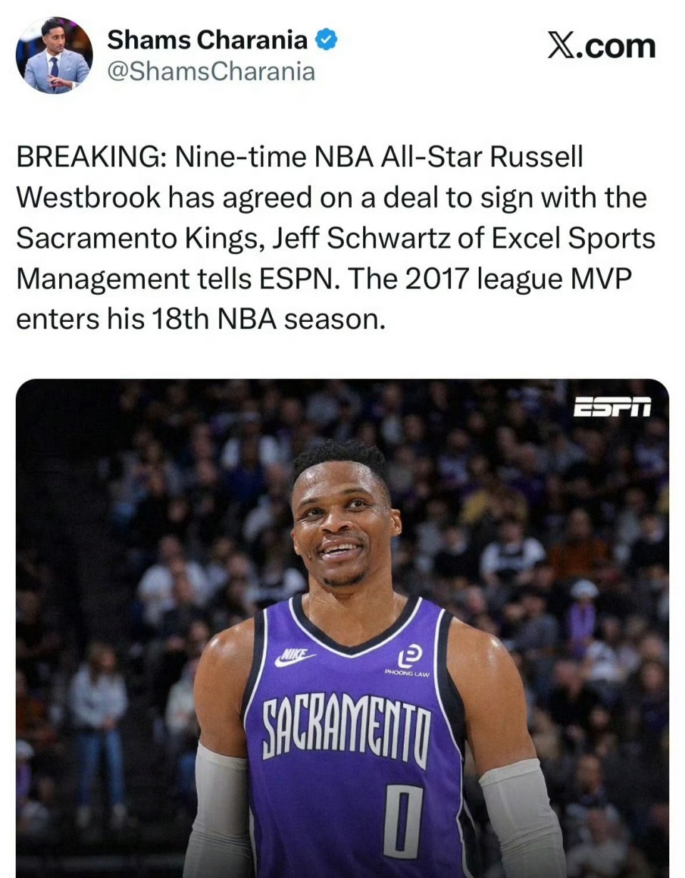 据nba“爆料大王”Shams Charania透露,威斯布鲁克已经与国王队达成协议,将在萨克拉门托开启生涯第18个赛季,这也将是他职业生涯效力的第8支球队(包含犹他爵士)。